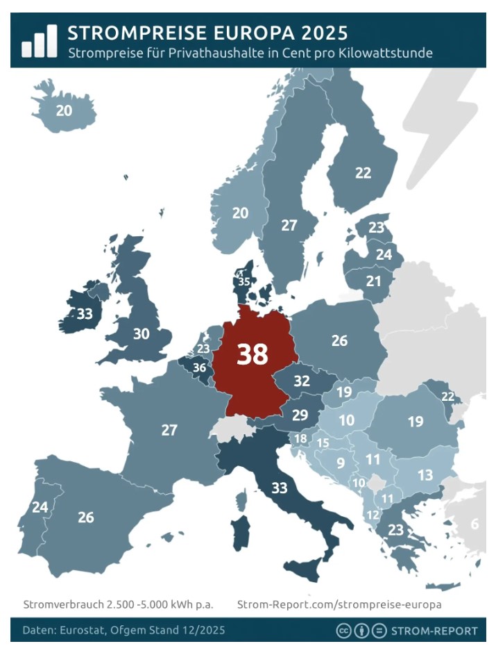 Here is what we have to pay for electricity in germany: 38 cent per kwh. That is the most in whole Europe.